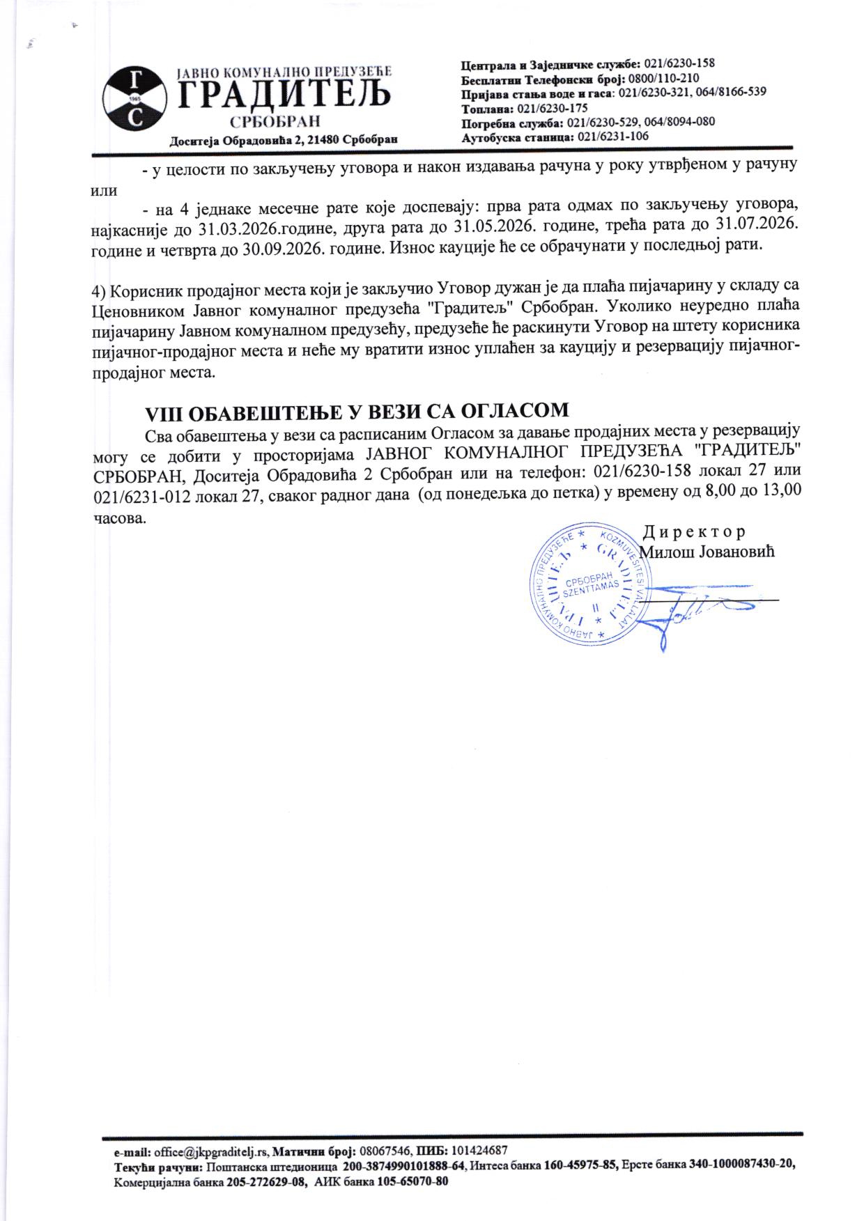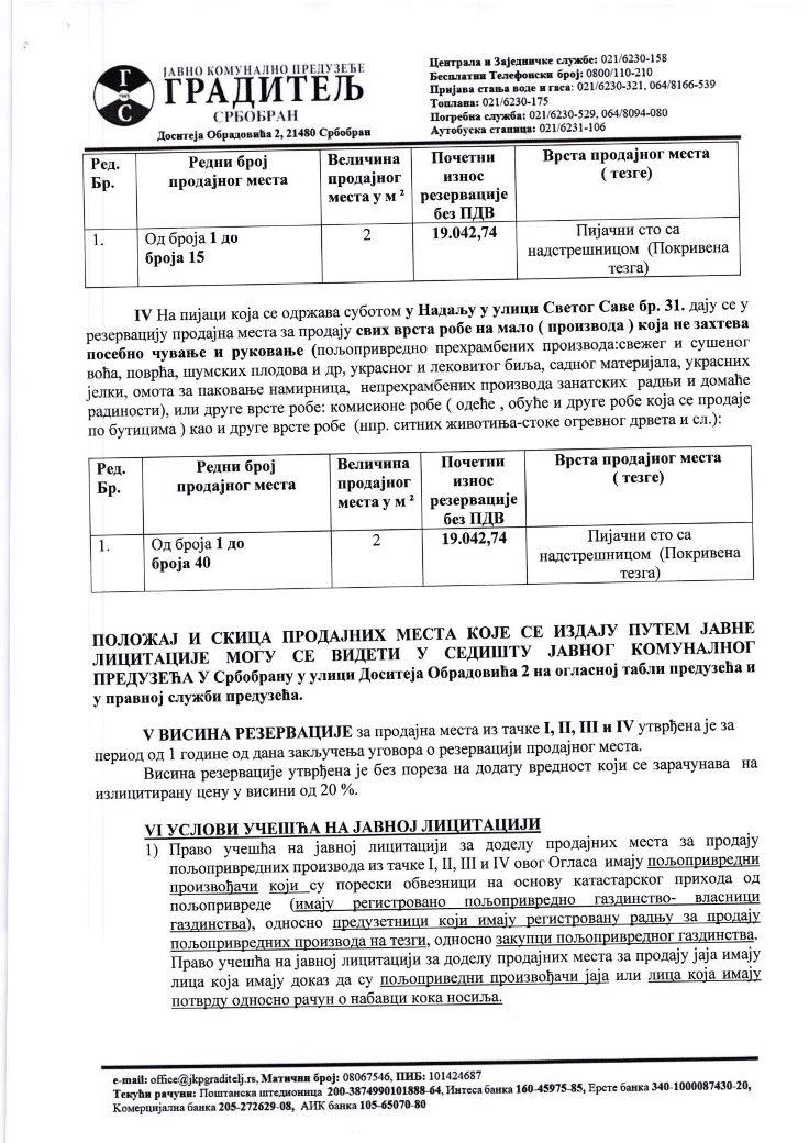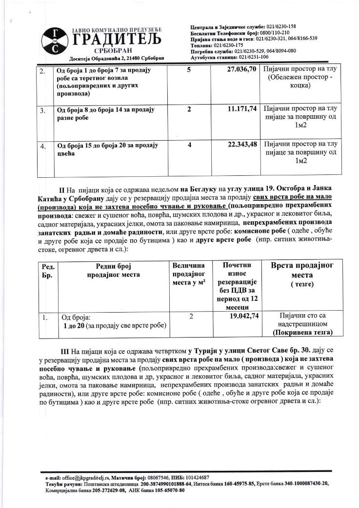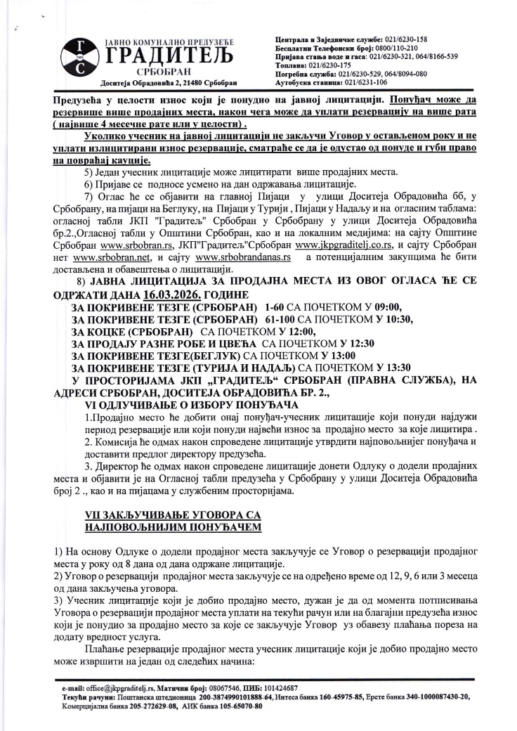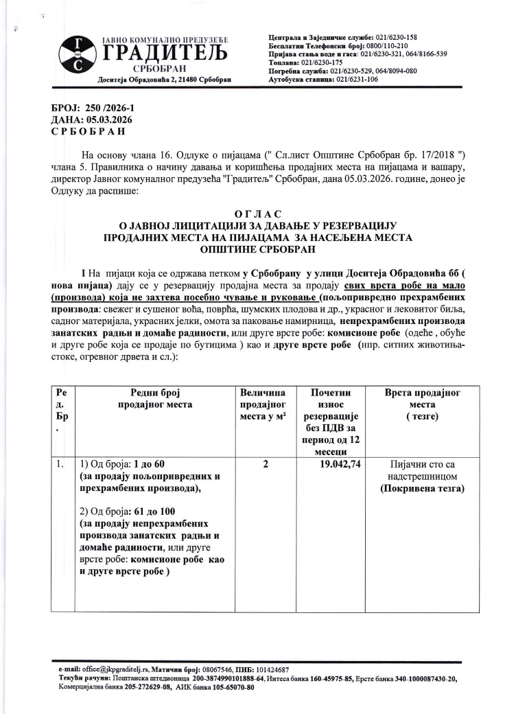 Јавно комунално предузеће "Градитељ" заказало је за понедељак, 16. март, лицитацију за покривене тезге, коцке за продају робе са возила и коцке за продају разне робе и цвећа, за све четири пијаце: у Србобрану у улици Доситеја Обрадовића бб и на углу улица 19. октобра и Јанка Катића, као у Турији у улици Светог Саве 30, и у Надаљу у улици Светог Саве 31.